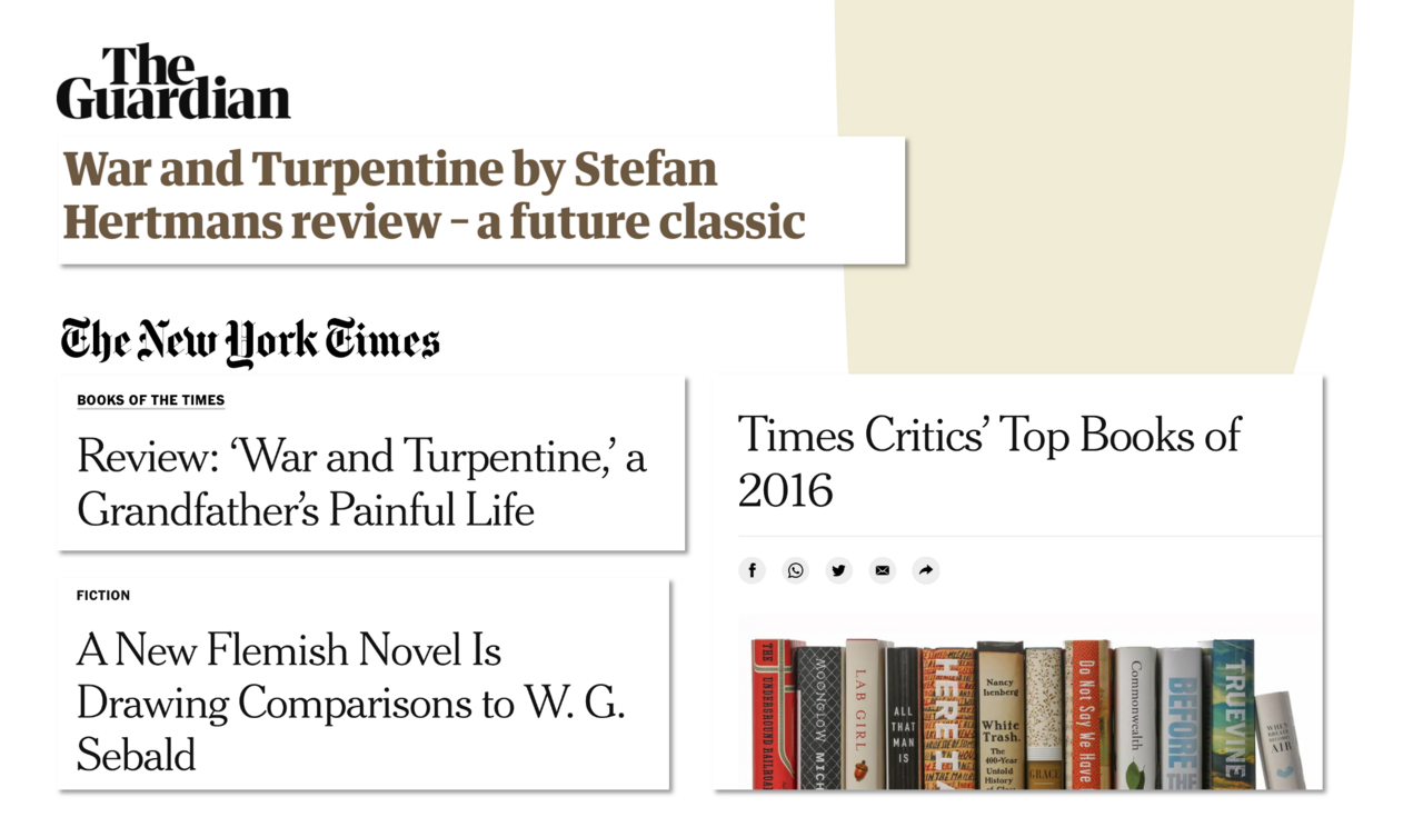 In the weeks after its release in the UK, War and Turpentine was reviewed in Kirkus, The Sunday Times, Publishers Weekly, The Guardian and The Times. All were positive, but Neel Mukherjee’s review in The Guardian stands out as the most glowing and, as it turned out, most prophetic. He calls Hertmans “one of the great living Flemish poets” and praises the book’s blending of different generic conventions. Mukherjee closes his article with a bold consecratory proclamation: