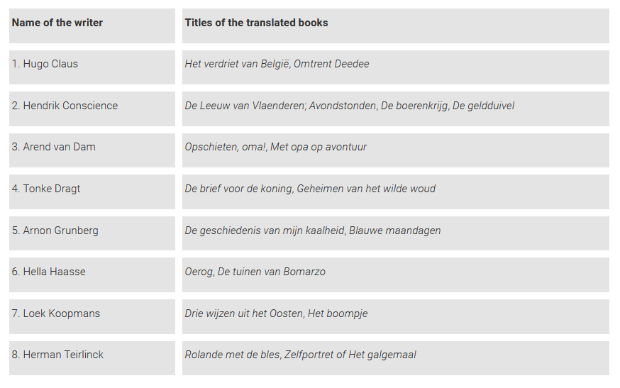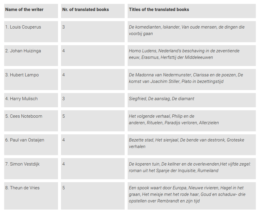 If, on the other hand, the writers included in this hypothetical canon were to be chosen based on which one of them has more than one work published in a Romanian translation, the database shows that there are eight writers that distinguish themselves by having had more than two books published in Romania (first table) and eight writers with two books to their name in Romanian (second table). An important thing to be mentioned here is the fact that the Dutch and Flemish Literary Funds played a key role in the decision to publish (or not) one or more titles from the same writer. These funds grant the publishing houses subsidies in order to support the spread of Dutch literature, but they can only subsidize two titles from the same author (meaning that the costs for further titles fall entirely on the publishing house).
